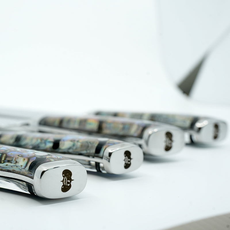 Slice through your culinary adventures with the Toadfish Abalone Chef Knife Set—where Japanese steel meets coastal charm. This four-piece collection features a Chef's, Santoku, Utility, and Paring knife, each forged from ultra-durable Damascus steel for razor-sharp precision that lasts. The real showstopper? Sustainably sourced abalone inlays that shimmer with iridescent beauty in every handle. Whether you're prepping weeknight dinners or impressing dinner guests, these knives bring both performance and personality to your kitchen.